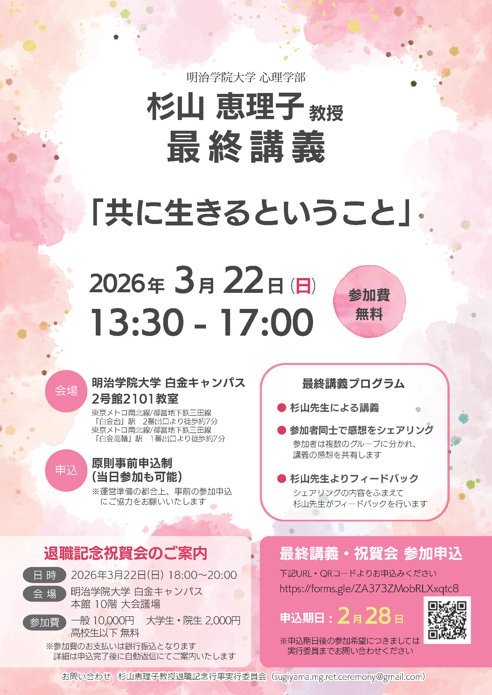 お問合せ先:明治学院大学心理学部 杉山恵理子教授退職記念行事 実行委員会